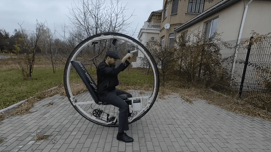 Начнем с интроцикла или моноколеса, которое создал Аркадий. Это изобретение мужчина наладил в родном Славянске. Моноколесо служит средством передвижения, которое развивает скорость до 15 км/ч. Механизм состоит из внутреннего и внешнего колеса, мотора, аккумулятора и сиденья. Ездить на этом колесе медленно и не удобно, ведь к принципу управления еще следует привыкнуть. Изобретатель планировал запатентовать свою работу, пока не началась полномасштабная война, которая испортила эти планы. И поэтому запчасти от этого интроцикла служат основой другого изобретения — наиболее популярного.