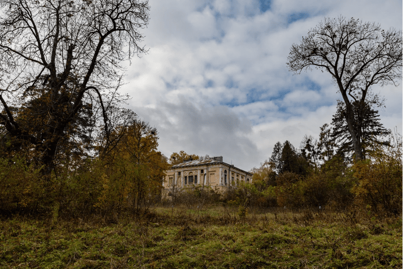 В самом Раевском парке сейчас тишина. Иногда видны полуразрушенные здания, старая стена построена из кирпича с буквами JHP. Возле дворца фонтан. Сам дворец выглядит так, будто с него содрали все самое лучшее. Остались голые стены, пятна, трещины. Богдан рассказывает, что ремонт давно не делали. А когда строили, то все делали по правилам: штукатурка на кованых гвоздях, известь на яйцах. Рядом с дворцом похоронен граф Потоцкий. Вот только россияне выбросили его кости.