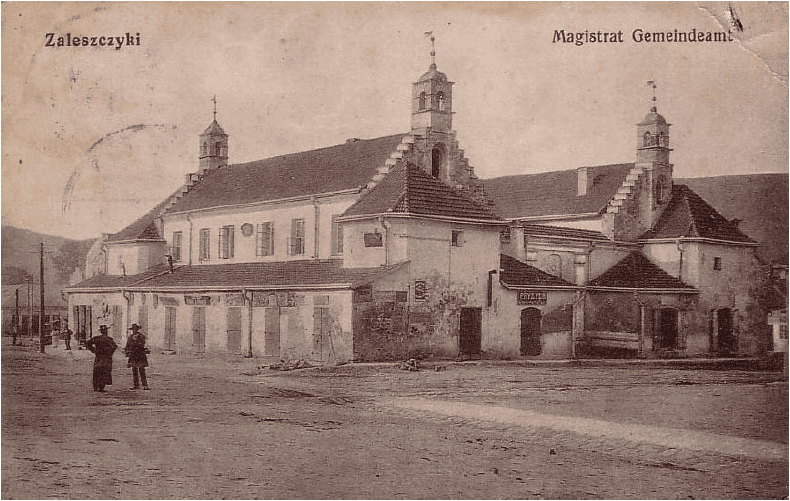 Ратуша была прямоугольной в плане (бывшая охотничья крепость, построенная по проекту барона Дицке), двухэтажная и состояла из двух корпусов, между которыми простирался небольшой двор. На углах размещались оригинальные сигнатурки со шпилями. Первый этаж здания был отдан под торговлю разным магазинам и складам, а на втором находились кабинеты чиновников, то есть магистрат Залещиков.
