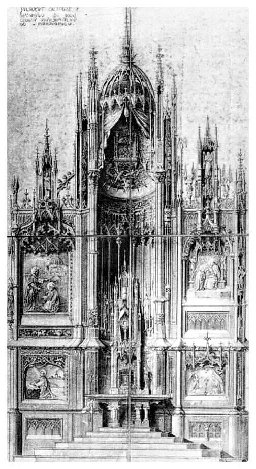 Силуэт костела выглядел чрезвычайно ажурным благодаря многочисленным пристройкам и многочисленным меньшим и большим окнам в часовнях.