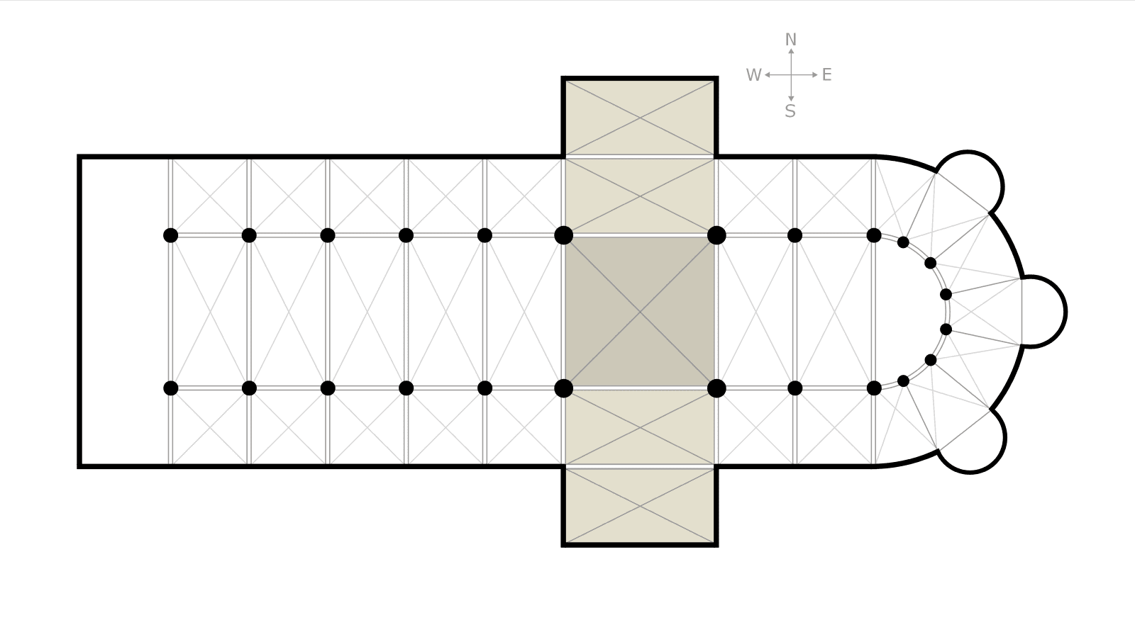 Вызвали восхищение два огромных живописных окна на фасаде передних рамён трансепта, каждое из которых увенчано большой круглой розеткой. Над пересечением невы и трансепта построен большой купол, увенчанный восьмигранным фонарем со стройной макушкой и шпилем. В куполе пробиты четыре больших арочных окна.