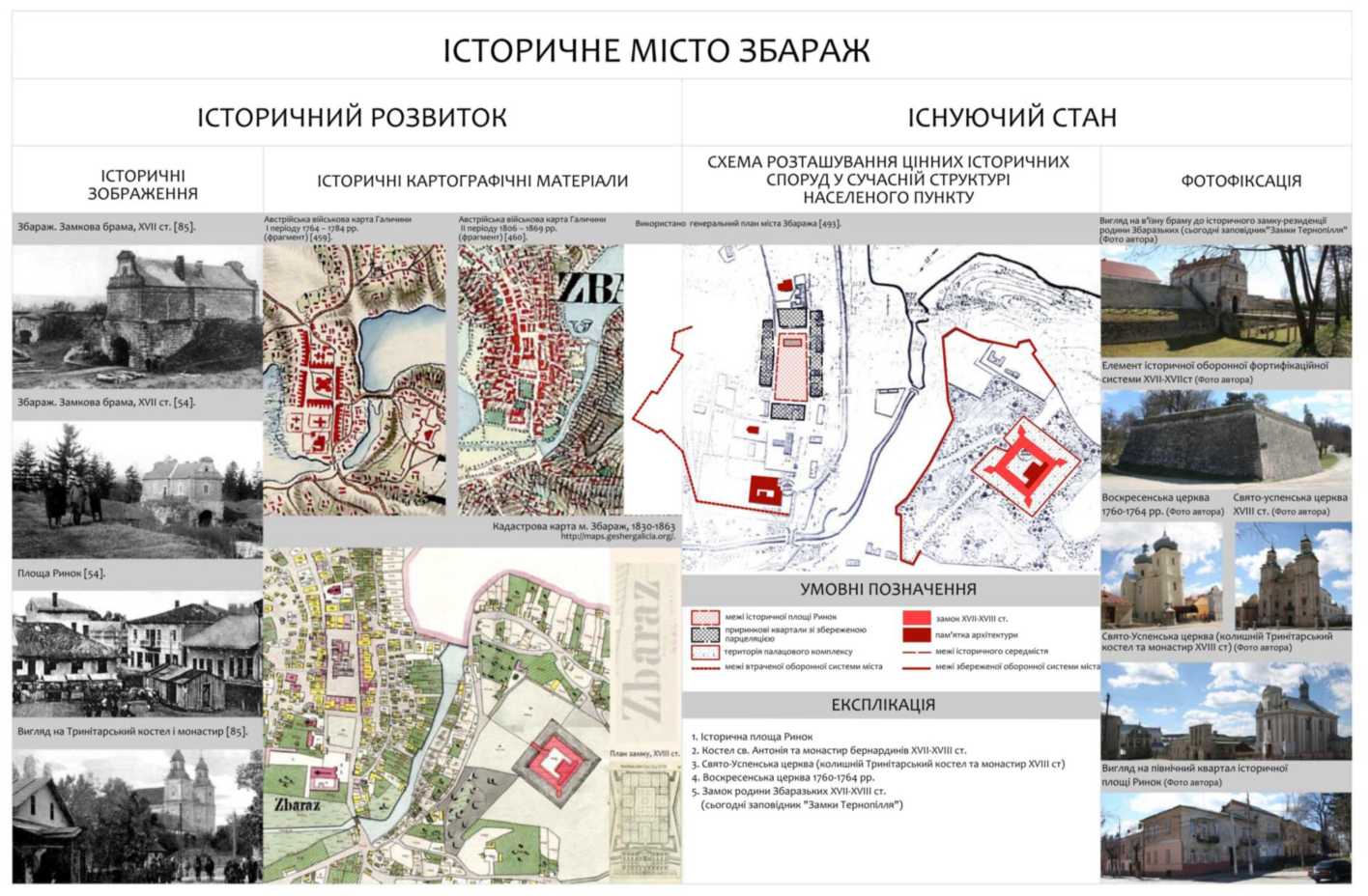 На сьогодні серед збережених пам’яткових споруд історичного середмістя головними є: палац XVII ст. із фортифікаційною системою; костел і монастир отців Бернардинців (1627); Успенська церква (колишній Тринітарський костел (1755-1758)); Церква Воскресіння Христового (1764); фрагменти ринкової квартальної забудови; елементи розпланувальної структури колишнього середмістя. Перелічені історичні споруди та комплекси формують простір сучасного міського середовища Збаража. Ці об’єкти за рахунок складного ландшафту утворюють живописну об’ємно-просторову композицію міста, яка вирізняється геометрично правильним розплануванням території середмістя, що походить із періоду XVII ст.