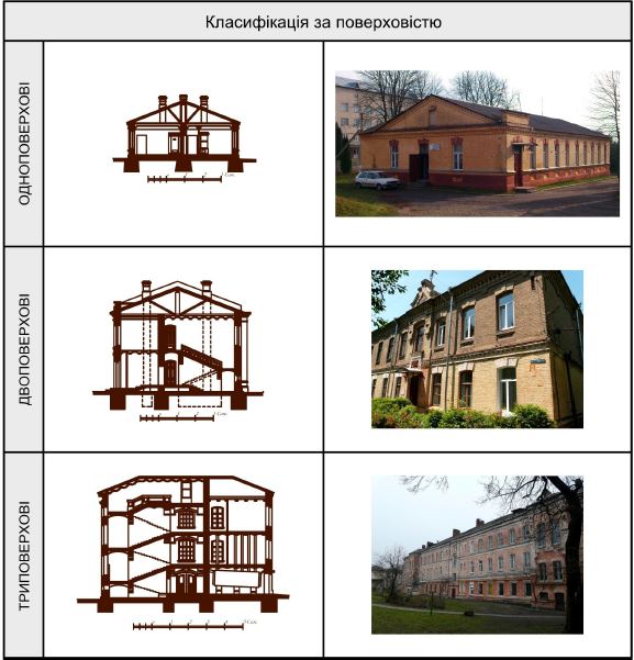 Під час будівництва казарм архітектори вирішували питання його вентиляції та інсоляції (потік сонячної радіації на одиницю площі горизонтальної поверхні за одиницю часу. Інсоляція впливає на перебіг фізичних, хімічних і біохімічних процесів), тобто по простому, доступу до сонячного світла. А тому капітальні стіни були в поперечних осях будівлі. Перегородки між приміщеннями для сну військових були мінімальні, щоб повітря вентилювалося. Казарми переважно планувались одноповерховими, але коштів не вистачало і вони були 2-х та 3-х поверховими. Коридор знаходився по центру. Будівля була прямокутною. В госпітальних будівлях коридор знаходився вздовж однієї із зовнішніх стін.