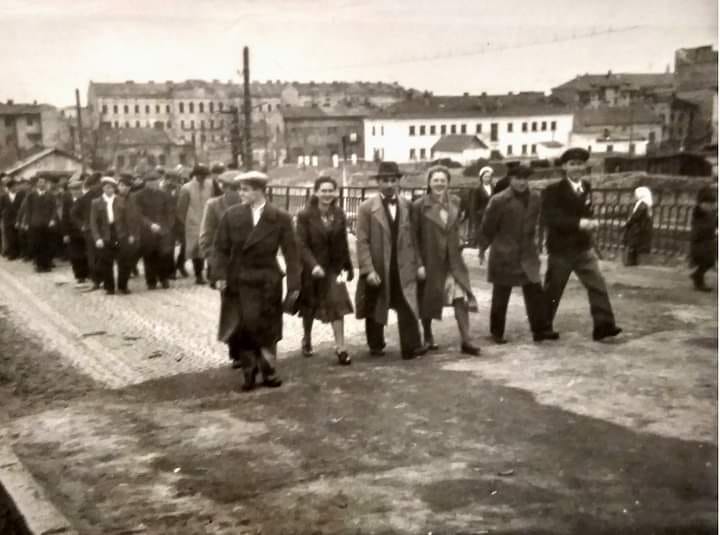 У Тернополі – 1947 рік. На дальньому плані будівля теперішньої першої школи а люди йдуть по залізничному мості, видно паркан від колії…). Фото із сторінки Віктора Мадрі